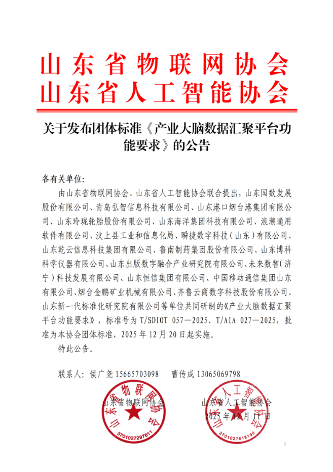 由山东省物联网协会、山东省人工智能协会联合提出,山东国数发展股份有限公司、青岛弘智信息科技有限公司、山东港口烟台港集团有限公司、山东玲珑轮胎(601966)股份有限公司、山东海洋集团科技有限公司、浪潮通用软件有限公司、汶上县工业和信息化局、瞬捷数字科技(山东)有限公司、山东乾云信息科技集团有限公司、鲁南制药集团股份有限公司、山东博科科学仪器有限公司、山东出版(601019)数字融合产业研究院有限公司、未来数智(济宁)科技发展有限公司、山东恒信集团有限公司、中国移动(600941)通信集团山东有限公司、烟台金鹏矿业机械有限公司、齐鲁云商数字科技股份有限公司、山东新一代标准化研究院有限公司等单位共同研制的《产业大脑数据汇聚平台功能要求》,标准号为T/SDIOT057—2025、T/AIA027—2025,批准为本协会团体标准,2025年12月20日起实施。