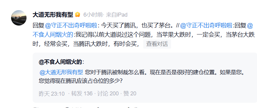 有投资人进一步提问:“每天1000万元,一年30亿,3—5年买1%的腾讯,是这样吗?”段永平回复:“如果一直掉的话就有可能,也为此做好准备,但主要是折腾短期的puts,赚点保费。其实最后动用的资金可能远比看上去的少,另外万一涨上去了我就停了。”