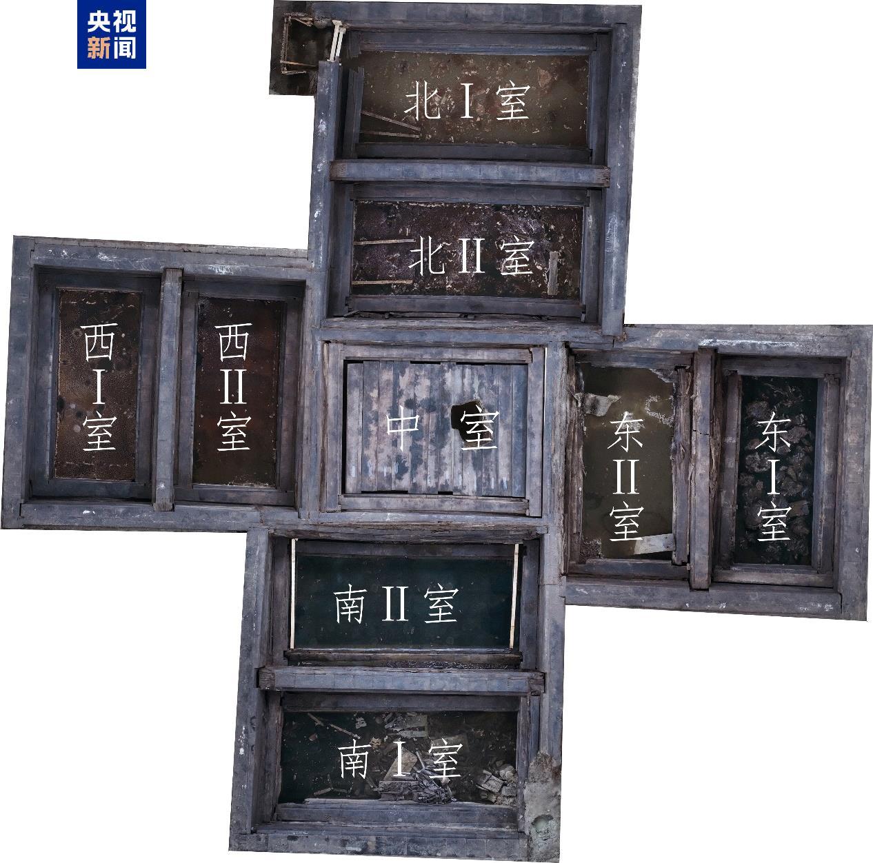 武王墩墓地利用古河道修筑围壕,整体近似方形。武王墩一号墓坐落在陵园中部,上部保存高约14米的封土,墓坑为近方形竖穴土坑,边长51米、深20米,东侧有长约42米的斜坡墓道,墓坑四壁有21级台阶逐级内收,坑内填土层层夯实。墓坑中部用枋木构筑“亚”字形椁室。椁室分为九室,中央为棺室,内置三重髹漆木棺,棺室四周分列八个侧室,放置各类随葬器物。椁室所用木材上均写有墨书文字及与之对应的刻凿符号,标示椁板方位和侧室名称。墨书文字格式大体一致,是目前发现数量最多、内容最丰富的楚国墨书文字。